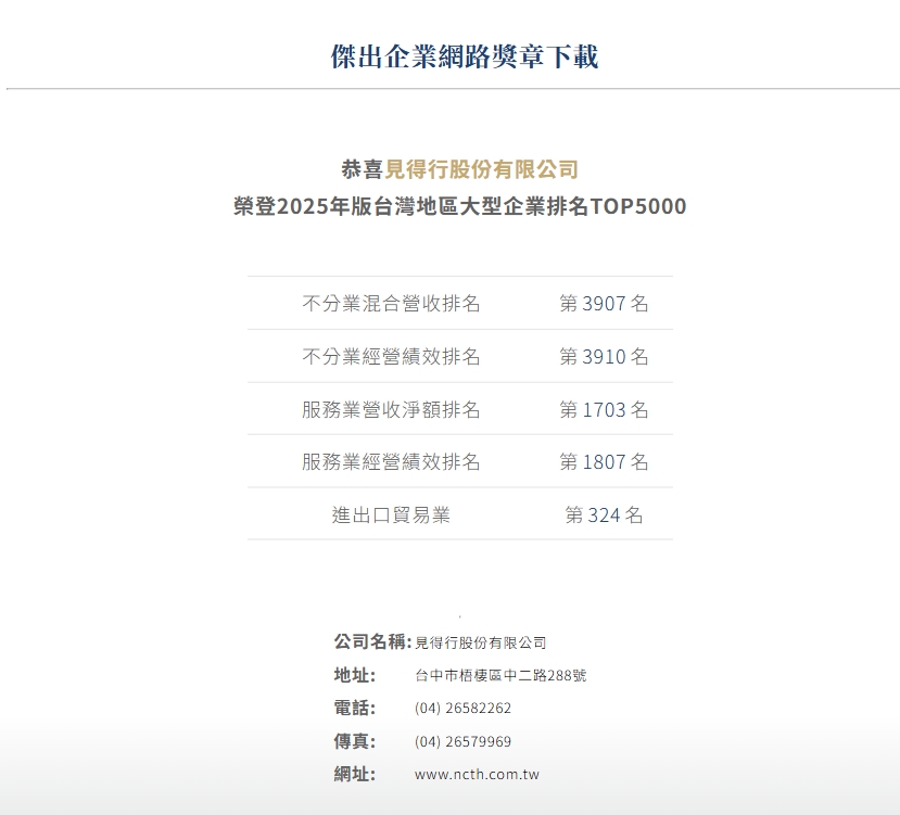 ▪ 公民營企業混合排名:第3907名▪ 服務業營收淨額排名:第1703名▪ 進出口貿易業排名:第324名 LINK: NCTH Awarded the “7th Taichung City Distinguished Industrial Innovation Award – Product Innovation Award”